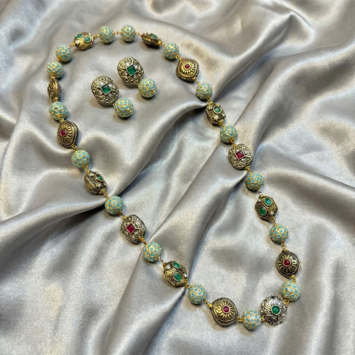 Add a touch of timeless elegance to your jewellery collection with this stunning green beads necklace set, designed for women who love classic yet statement styles. This beautifully crafted antique beads necklace features a detailed long necklace design with intricately carved elements and vibrant stone accents, making it perfect for festive and ethnic wear. This premium necklace set for women blends traditional craftsmanship with modern aesthetics, offering a versatile look that pairs effortlessly with sarees, suits, and lehengas. Whether you are looking for a stylish green necklace set, a bold stone necklace set, or a graceful simple necklace, this design meets all styling needs. Ideal for weddings and celebrations, this antique necklace set also comes with matching earrings, making it a complete necklace and earring set. Designed for both women and girls, it works perfectly as a necklace for lehenga or festive outfit. Explore the latest necklace design trends with this elegant green stone necklace, crafted to give a luxurious look at an affordable price.