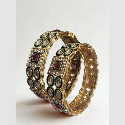 Silver-Gold Brass Kada Bracelet with Red & Green Stone Pearl Work